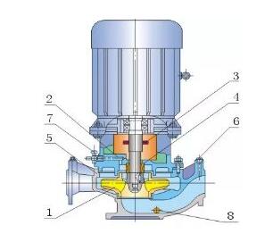 1、葉輪 2、泵蓋 3擋水圈 4、機械密封 5泵體 6、取壓塞 7、放氣閥 8、放水塞